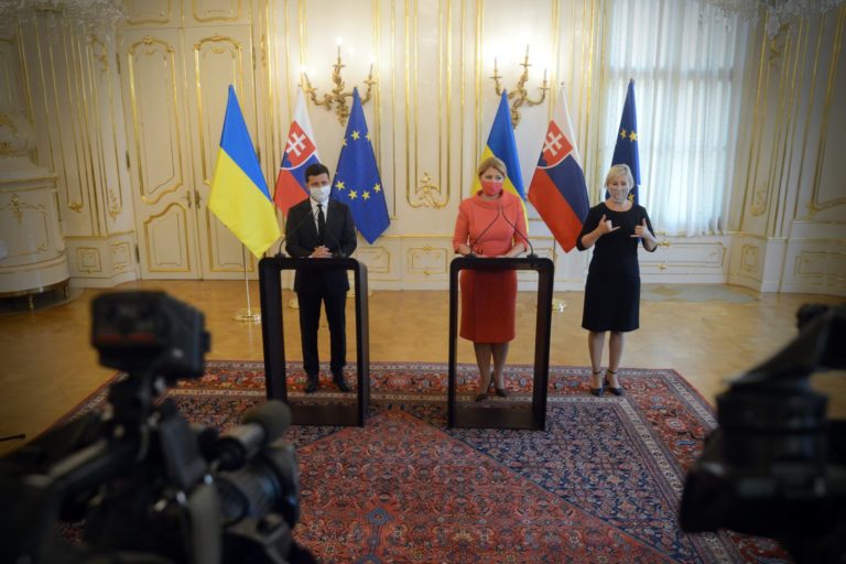 Sprava: Prezidentka SR Zuzana Čaputová a prezident Ukrajiny Volodymyr Zelensky počas tlačovej konferencie v Prezidentskom paláci pri príležitosti návštevy ukrajinského prezidenta na Slovensku. Bratislava, 24. september 2020. Foto: SITA/Jakub Julény