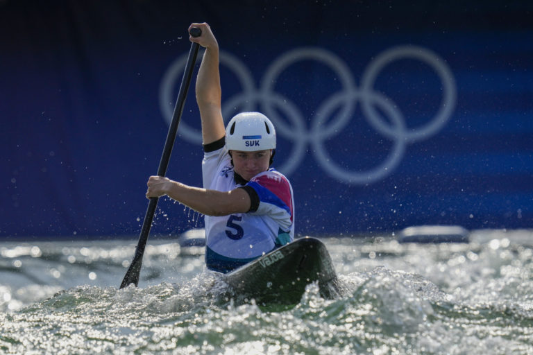 Slovenská reprezentantka vo vodnom slalome Zuzana Paňková počas kvalifikácie C1 na letnej olympiáde v Paríži. Vaires-sur-Marne, 30. júl 2024. Foto: SITA/AP.