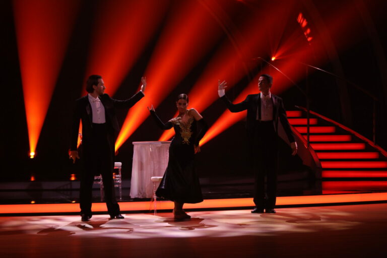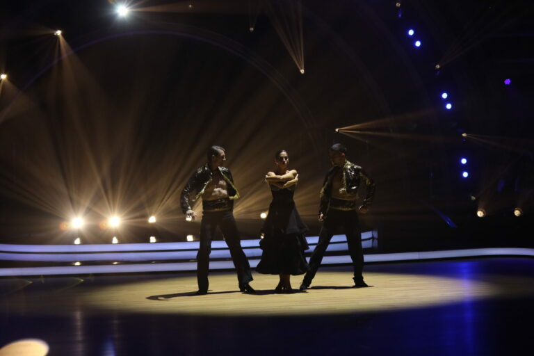 Paso doble v podaní Zuzany Porubjakovej, Jaroslava Ihringa a Juraja Loja v semifinále Let's dance 2025. Bratislava (Incheba), 27. apríl 2025. Foto: TV Markíza.