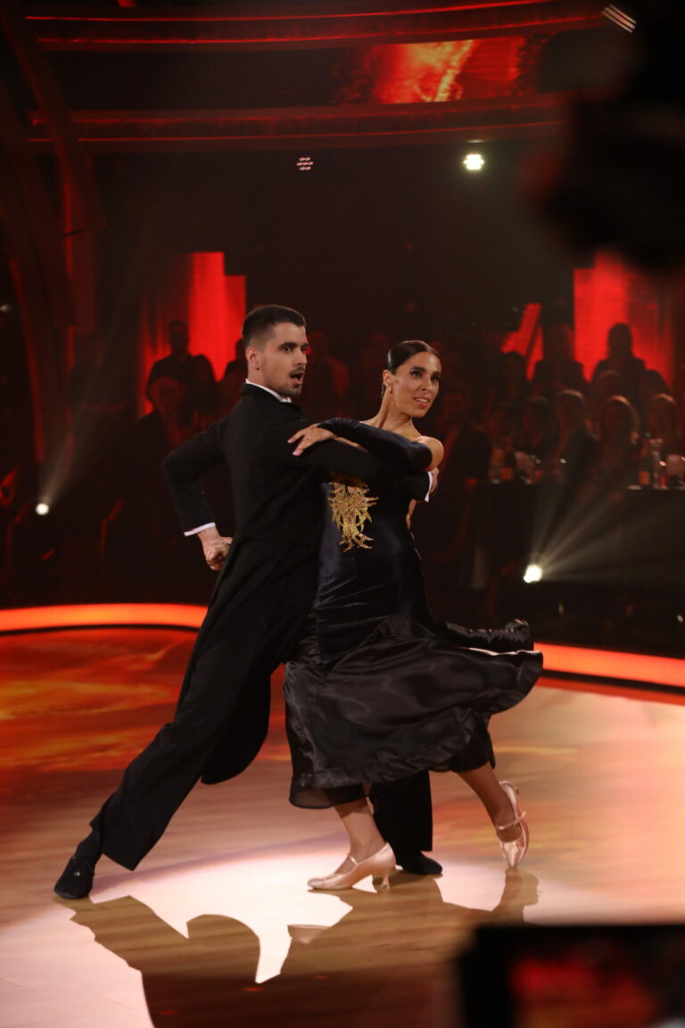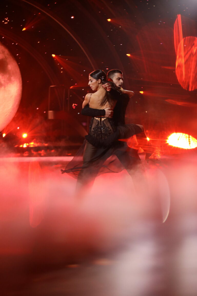 Zuzana Porubjaková počas semifinále let's dance 2025, v ktorom si paso doble okrem svojho tanečného partnera Jaroslava Ihringa zatancovala aj s Jurajom Lojom. Bratislava (Incheba), 25. apríl 2025. Foto: TV Markíza.