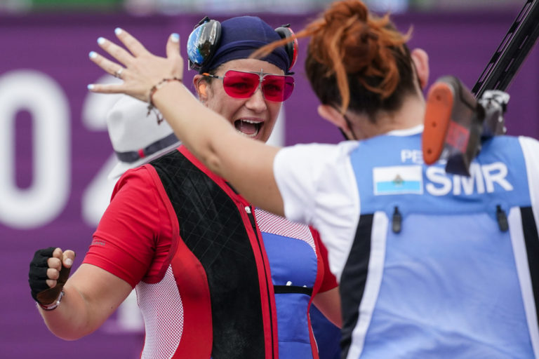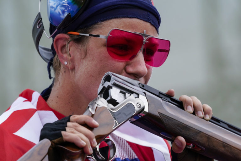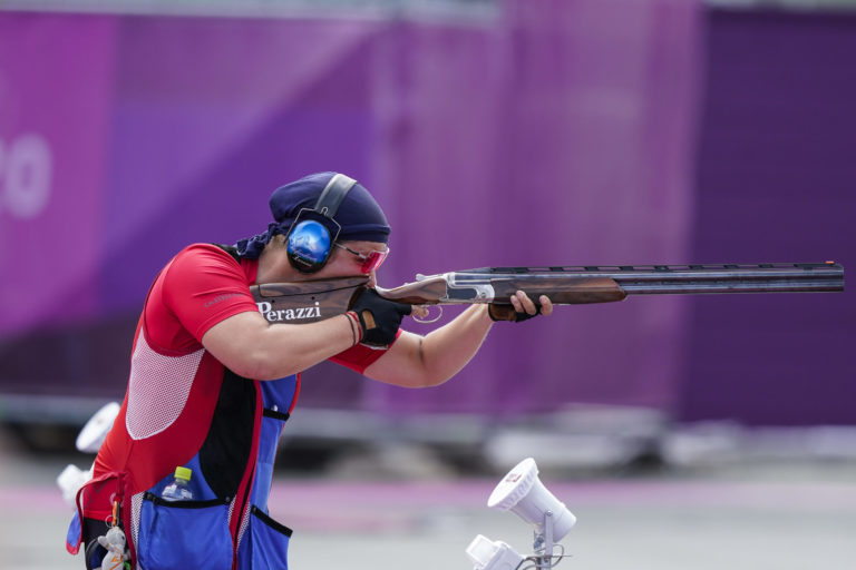 Slovenská strelkyňa Zuzana Rehák Štefečeková ovládla súťaž v trape žien a získal zlatú medailu na letnej olympiáde v Tokiu. Tokio, 29. júl 2021. Foto: SITA/AP
