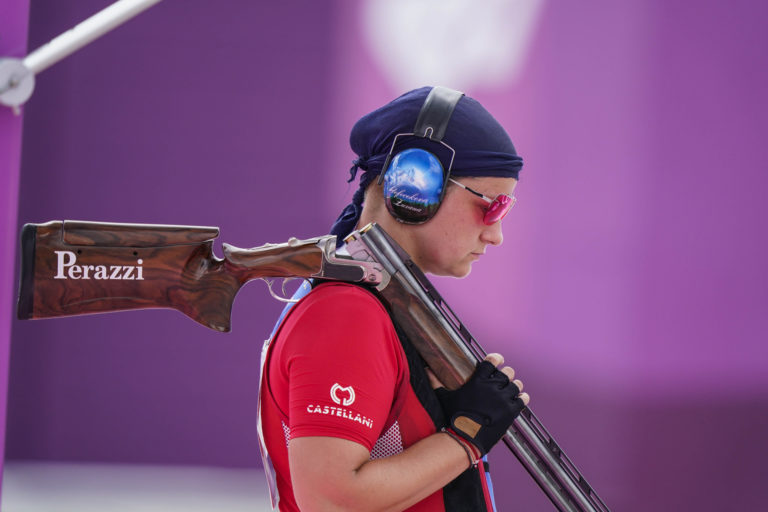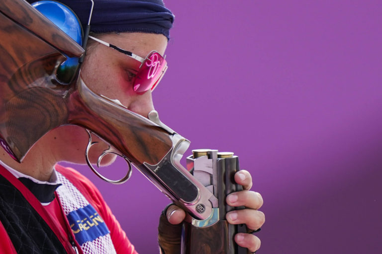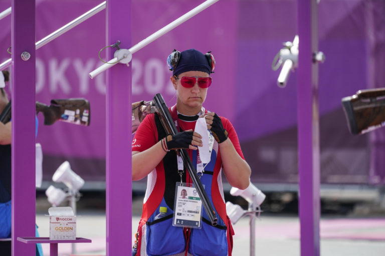 Slovenská reprezentantka Zuzana Rehák Štefečeková počas prvého dňa kvalifikácie trapu na letnej olympiáde v Tokiu. Tokio, 28. júl 2021. Foto: SITA/AP.