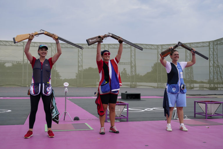 Medailistky v trape žien na letnej olympiáde v Tokiu - zľava: Kayle Browningová (striebro), Zuzana Rehák Štefečeková (zlato), Alessandra Perilliová (bronz). Tokio, 29. júl 2021. Foto: SITA/AP