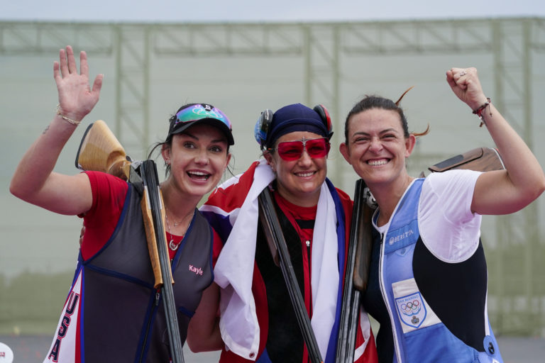 Slovenská strelkyňa Zuzana Rehák Štefečeková získala zlatú medailu v trape žien (uprostred), striebro získala Američanka Kayle Browningová (vľavo) a bronz Alessanda Perilliová zo San Marína (vpravo) na letnej olympiáde v Tokiu. Tokio, 29. júl 2021. Foto: SITA/AP
