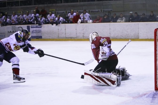 Marek Šimko z HKM Zvolen (vpravo) a Austin Block (vľavo) z HC'05 Banská Bystrica počas dohrávky 1. kola Tipsport extraligy medzi HKM Zvolen - HC ´05 Banská Bystrica. Dohrávka od 58:33 min za stavu 4:3. Zvolen, 7. október 2014. Foto: SITA/Ján Viazanička