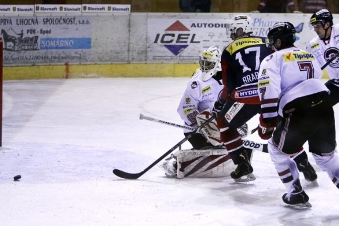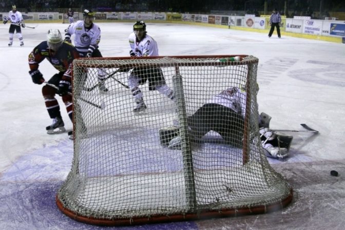 Marek Šimko z HKM Zvolen (druhý sprava) a Austin Block (vľavo) z HC'05 Banská Bystrica počas dohrávky 1. kola Tipsport extraligy medzi HKM Zvolen - HC ´05 Banská Bystrica. Dohrávka od 58:33 min za stavu 4:3. Zvolen, 7. október 2014. Foto: SITA/Ján Viazanička