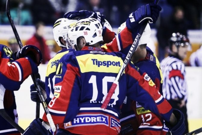 Radosť hráčov HKM Zvolen po víťaznom zápase počas dohrávky 1. kola Tipsport extraligy medzi HKM Zvolen - HC ´05 Banská Bystrica. Dohrávka od 58:33 min za stavu 4:3. Zvolen, 7. október 2014. Foto: SITA/Ján Viazanička