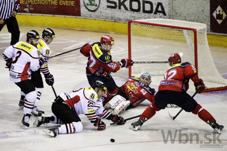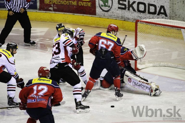 Marek Šimko z HKM Zvolen (druhý sprava) a Austin Block (vľavo) z HC'05 Banská Bystrica počas dohrávky 1. kola Tipsport extraligy medzi HKM Zvolen - HC ´05 Banská Bystrica. Dohrávka od 58:33 min za stavu 4:3. Zvolen, 7. október 2014. Foto: SITA/Ján Viazanička