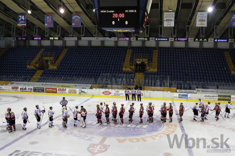 Koniec zápasu pred prázdnym štadiónom po dohrávke 1. kola Tipsport extraligy medzi HKM Zvolen - HC ´05 Banská Bystrica. Dohrávka od 58:33 min za stavu 4:3. Zvolen, 7. október 2014. Foto: SITA/Ján Viazanička