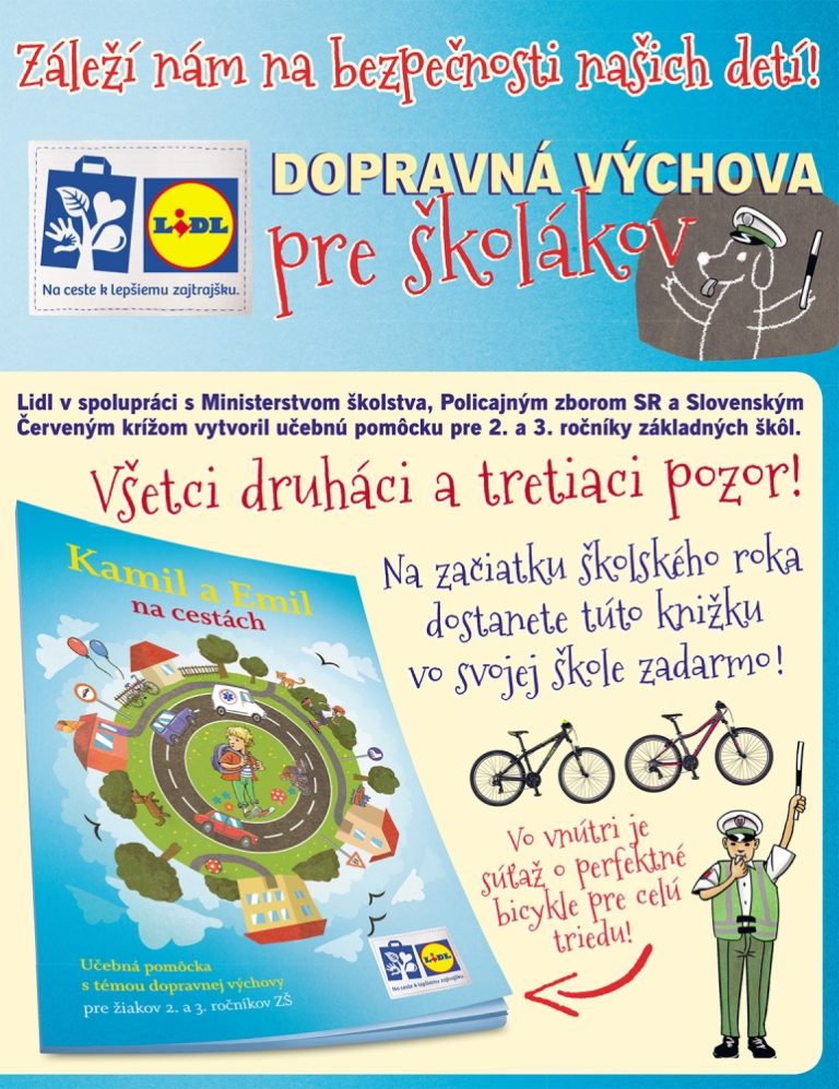 BRATISLAVA 2. septembra (WBN/PR) – Ľudský život je najvyššou hodnotou a preto ho treba chrániť. Najzraniteľnejšie sú deti, obzvlášť v rámci rôznych situácií v cestnej premávke. Lidl sa preto rozhodol prispieť k vzdelávaniu školákov v téme dopravnej výchovy a na začiatku školského roka 2016/2017 poskytne zdarma každému žiakovi 2. a 3. ročníka na každej základnej škole na Slovensku publikáciu „Kamil a Emil na cestách.“ Obchodný reťazec pripravil knižku v spolupráci s Ministerstvom školstva, Policajným zborom a Slovenským Červeným krížom. Jej náklad presahuje 115 000 kusov, dostanú ju všetci žiaci spomenutých ročníkov a tiež ich triedni učitelia.