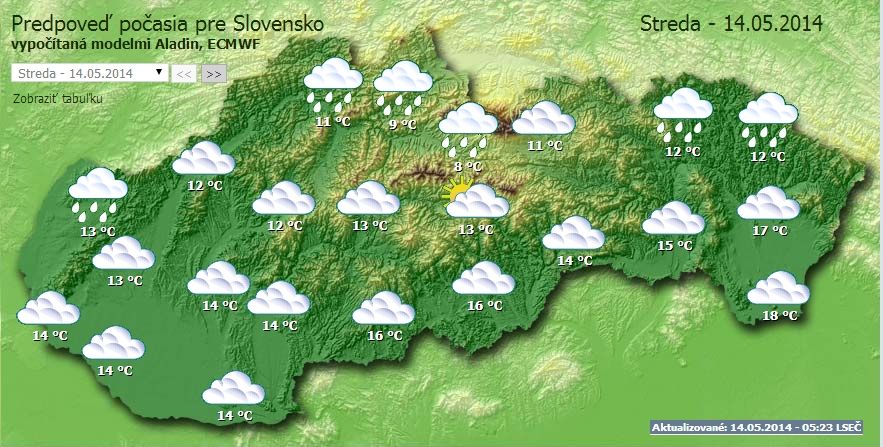 Streda prinesie oblačné až zamračené počasie, miestami aj občasný dážď, v severnej polovici územia sa na mnohých miestach vyskytnú zrážky. Od cca 1600 metrov nad morom môže aj snežiť.