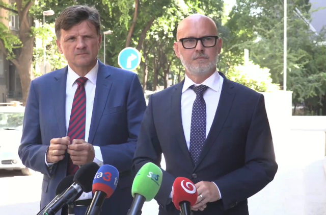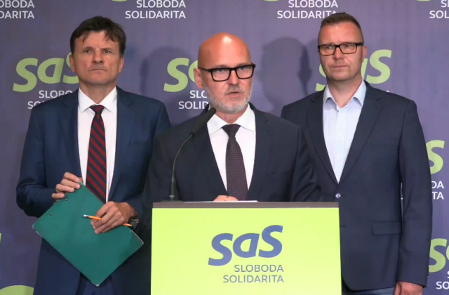 Poslanec Tomáš Szalay (vpravo), predseda strany Sloboda a Solidarita Branislav Gröhling a podpredseda SaS Marián Viskupič na tlačovej besede o odvolávaní ministra zdravotníctva SR Kamila Šaška. Pondelok, 11. august, 2025.Reprofoto: www.facebook.com