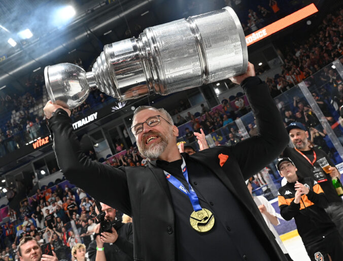 Tréner HC Košice Dan Ceman s majstrovským Pohárom Vladimíra Dzurillu po 7. finálovom zápase Tipos extraligy, v ktorom "oceliari" zdolali Nitru 5:4 po predĺžení. Košice (Steel Aréna), 29. apríl 2025.Foto: SITA/Viktor Zamborský.