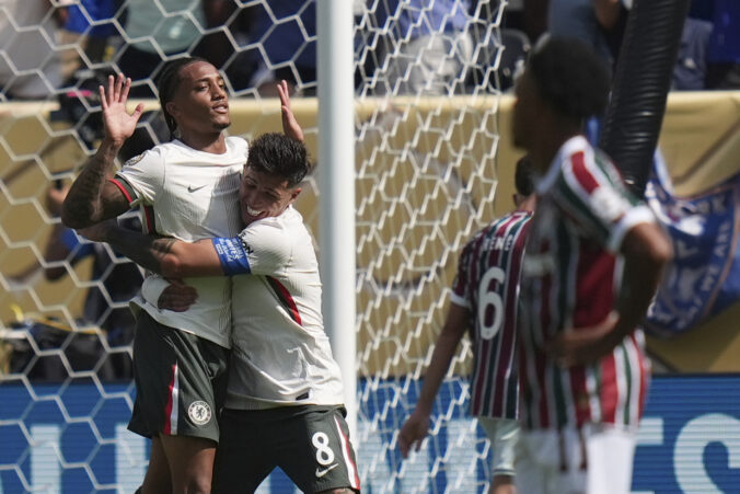 Útočník Chelsea Joao Pedro (vľavo) zaujal ospravedlňujúci postoj po svojich dvoch góloch do bránky Fluminense v semifinále MS klubov vo futbale.Foto: SITA/AP