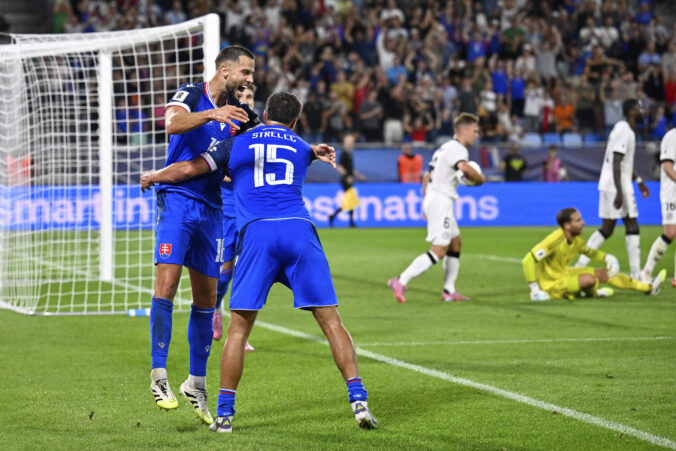 Slovenský reprezentant Dávid Hancko sa so spoluhráčmi teší zo svojho gólu v sieti Nemecka v zápase A-skupiny v kvalifikácii o postup na MS vo futbale 2026. Bratislava (Národný futbalový štadión), 4. september 2025.Foto: SITA/AP.