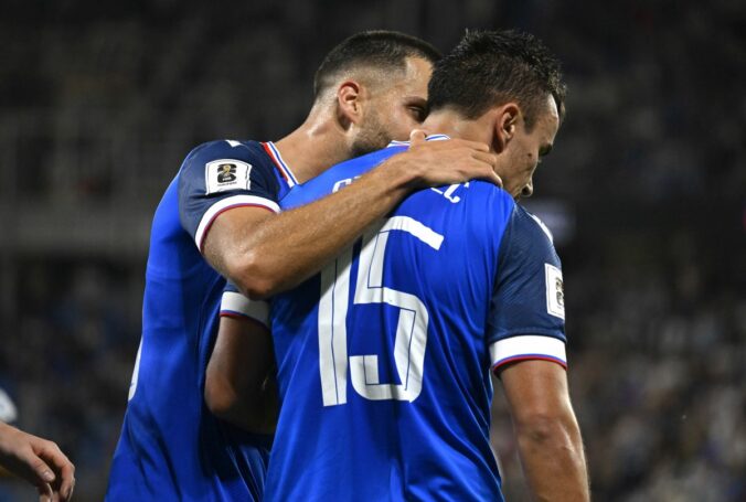 Dávid Hancko a Danel Sinani počas zápasu Luxembursko - Slovensko v A-skupine kvalifikácie o postup na MS vo futbale 2026. Luxemburg, 7. september 2026.Foto: SITA/AP.