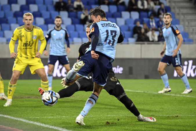 Dávid Strelec v drese ŠK Slovan Bratislava počas zápasu proti FC Košice v 12. kole Niké ligy 2023/2024. Bratislava, 29. október 2023.Foto: archívne, SITA/Milan Illík.