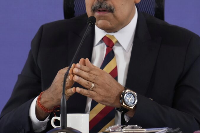 Venezuelský prezident Nicolás Maduro s hodinkami, ktoré mu darovala futbalová legenda Diego Maradona, na tlačovej konferencii v Caracase, v pondelok 1. septembra 2025.Foto: SITA/AP