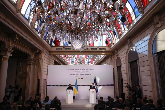 Spoločná tlačová konferencia francúzskeho prezidenta Emmanuela Macrona a Volodymyra Zelenského v piatok 7. júna 2024 v Elyzejskom paláci v Paríži. Americký prezident Joe Biden sa mal v piatok stretnúť s ukrajinským prezidentom Volodymyrom Zelenskym v Paríži, keďže kyjevská armáda prežíva najťažšie dni bojov od prvých týždňov vojny s Ruskom a pripravuje sa na to, čo podľa úradníkov môže byť ťažké leto.Foto: Yoan Valat, Pool via AP.