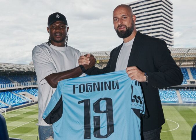 Generálny riaditeľ Slovana Ivan Kmotrík ml. a nova posila "belasých" Ezekiel Henty.Foto: www.skslovan.com.