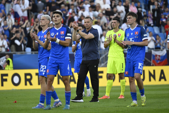 Tréner Jaroslav Kentoš a reprezentanti Slovenska do 21 rokov po prehre so Španielskom 2:3 v základnej A-skupine na ME vo futbale 2025. Bratislava (Národný futbalový štadión), 11. jún 2025:Foto: SITA/Milan Illík