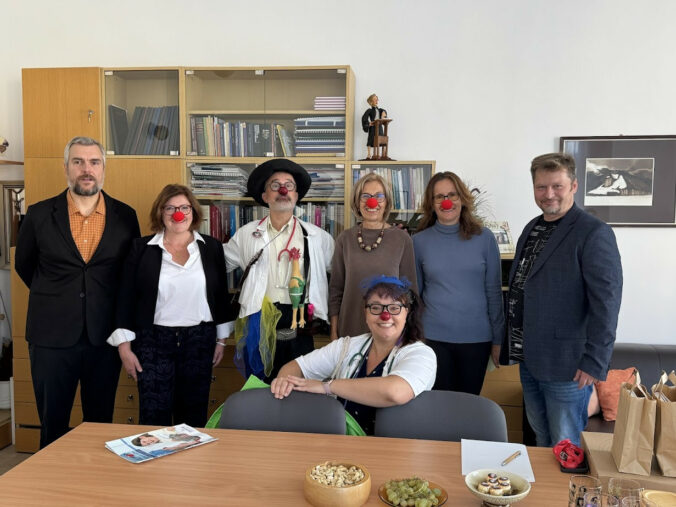 Zástupcovia LF UK so zástupcami Červeného nosa. Zľava: Milan Šagát, výkonný riaditeľ Červeného nosa, prof. MUDr. Alexandra Bražinová, PhD., MPH, prodekanka LF UK, zdravotný klaun Milan Chalmovský, prof. MUDr. Daniela Ostatníková, PhD., prodekanka LF UK, doc. MUDr. Michaela Kostičová, PhD., MPH, prednostka Ústavu sociálneho lekárstva a lekárskej etiky LF UK, Pavel Mihaľák, umelecký riaditeľ Červeného nosa, zdravotná klaunka Ria Benkovská.Foto: ČERVENÝ NOS Clowndoctors