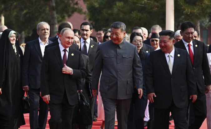 Zľava v prvom rade: ruský prezident Vladimir Putin, čínsky prezident Si Ťin-pching a severokórejský vodca Kim Čong-un kráčajú po spoločnom fotografovaní vedúcich zahraničných delegácií pozvaných na vojenskú prehliadku pri príležitosti 80. výročia kapitulácie Japonska v druhej svetovej vojne, v Pekingu v Číne v stredu 3. septembra 2025.Foto: Sergei Bobylev, Sputnik, Kremlin Pool Photo via AP