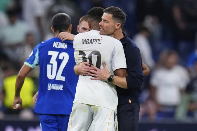 Kylian Mbappé z Realu Madrid (vľavo) sa objíma s trénerom Xabim Alonsom po skončení úvodného zápasu Ligy majstrov 2025/2026 medzi Realom Madrid a Olympique Marseille na Štadióne Santiaga Bernabéua v Madride, v utorok 16. septembra 2025.Foto: SITA/AP