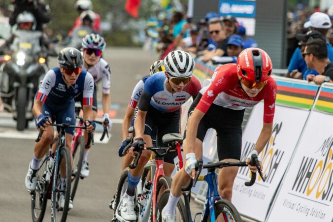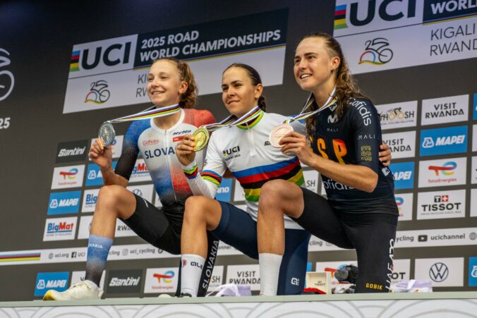 Na snímke vpravo slovenská cyklistka Viktória Chladoňová, ktorá získala bronzovú medailu na pretekoch s hromadným štartom.Foto: x.com