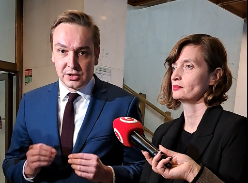 Zľava: Nová posila PS Ľudovít Ódor a podpredsedníčka PS Lucia Plaváková počas tlačovej besedy hnutia Progresívne Slovensko (PS), na ktorej predstavili novú posilu hnutia nielen do európskych volieb, Ľudovíta Ódora. Bratislava, 24. január 2024. Foto: SITA/Milan Illík