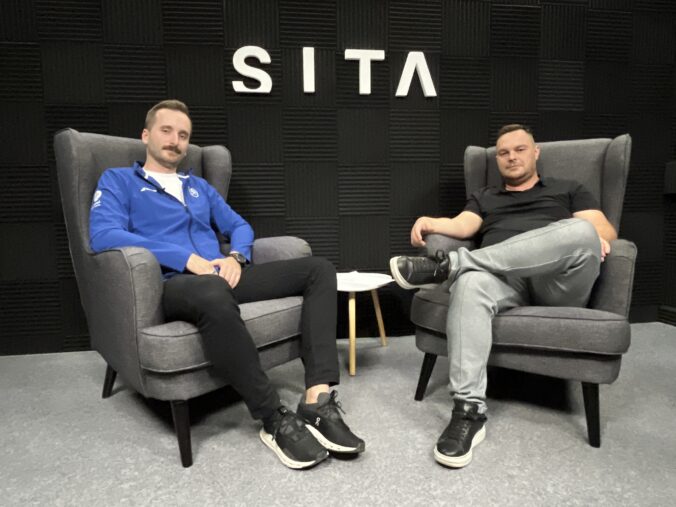 Michal Sabo, manažér Slovenskej padelovej asociácie v rozhovore s Karolom Jakubovičom pri natáčaní video podcastu V športovom SITE v Štúdiu SITA.Foto: SITA.