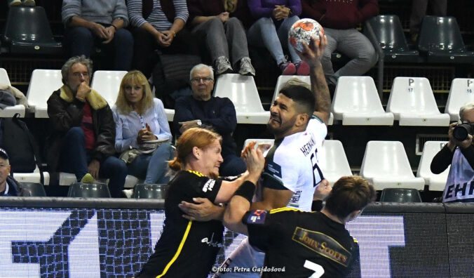 Kubánska spojka Tatrana Prešov Pavel Hernández strieľa jeden zo svojich siedmich gólov proti IK Sävehof.Foto: Tatran Prešov/Viktor Zamborský
