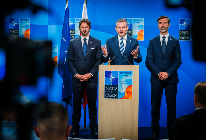 Zľava: Podpredseda vlády a minister obrany SR Robert Kaliňák, prezident SR Peter Pellegrini a minister zahraničných vecí a európskych záležitostí SR Juraj Blanár počas samitu Severoatlantickej aliancie (NATO) v Haagu v Holandsku, ktorého hlavnými témami boli aktuálne bezpečnostné výzvy a posilňovanie obranných kapacít členských štátov. Holandsko, Haag, 25. jún 2025.Foto: SITA/Kancelária prezidenta SR
