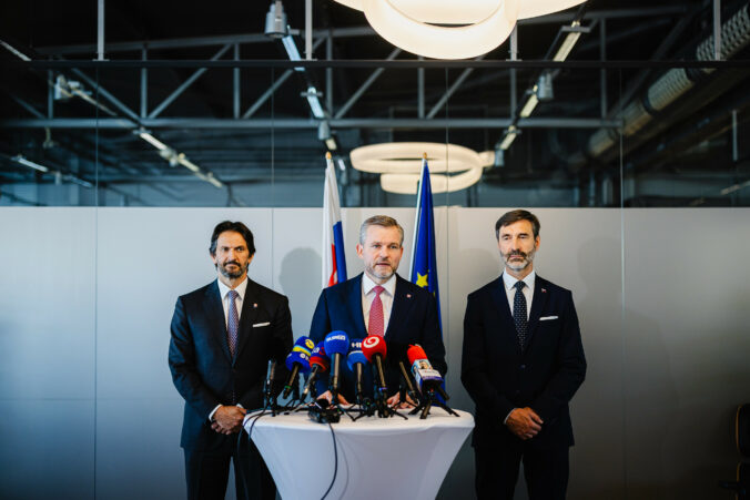 Zľava: Podpredseda vlády SR a minister obrany SR Robert Kaliňák, prezident SR Peter Pellegrini a minister zahraničných vecí a európskych záležitostí SR Juraj Blanár počas tlačovej konferencie pred odchodom na samit Severoatlantickej aliancie (NATO) v Haagu v Holandsku, ktorého témami budú aktuálne bezpečnostné výzvy a posilňovanie obranných kapacít členských štátov. Bratislava, 24. jún 2025.Foto: SITA/Kancelária prezidenta
