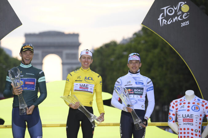 Slovinský cyklista Tadej Pogačar po 21. etape Tour de France 2022 s cieľom v Paríži.Foto: Etienne Garnier/Pool Photo via AP.