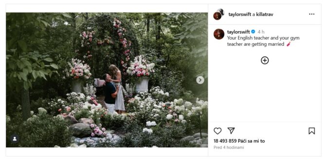 Speváčka Taylor Swiftová a hráč amerického futbalu Travis Kelce oznámili svoje zasnúbenie.Foto: www.instagram.com.
