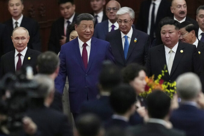 Zľava v prvom rade: ruský prezident Vladimir Putin, čínsky prezident Si Ťin-pching a severokórejský vodca Kim Čong-un kráčajú po spoločnom fotografovaní vedúcich zahraničných delegácií pozvaných na vojenskú prehliadku pri príležitosti 80. výročia kapitulácie Japonska v druhej svetovej vojne, v Pekingu v Číne v stredu 3. septembra 2025.Foto: Sergei Bobylev, Sputnik, Kremlin Pool Photo via AP