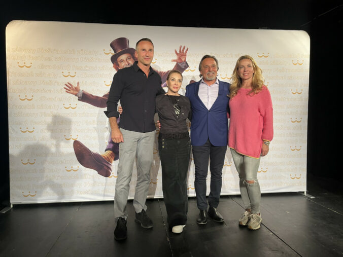 Zľava: umelecký riaditeľ Art Film Fest Košice 2023 Martin Palúch, herečka Zdena Studenková, primátor Košíc Jaroslav Polaček a hovorca festivalu Juraj Čurný počas odovzdávania ceny Hercová misia na Dolnej bráne v Košiciach. Košice, 17. jún 2023.Foto: SITA/Marek Lukáč.