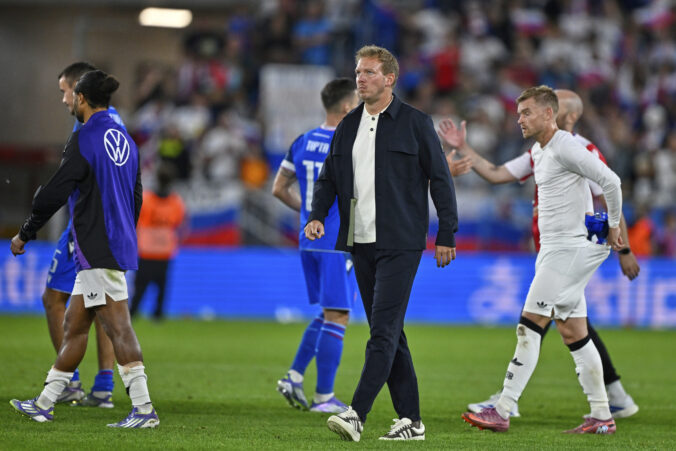 Tréner Nemecka Julian Nagelsmann (v strede) prežíval krátko po zápase na Tehelnom poli výrazne negatívne emócie, keďže jeho zverenci prehrali so Slovákmi 0:2.