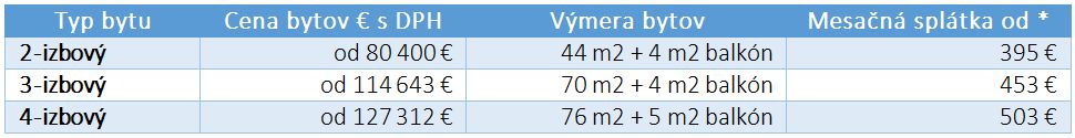 Najväčší záujem je o 3-izbové byty. Všetky byty sú dostupné v rôznych úrovniach štandardu a približne rok sa bude ponúkať možnosť kúpy v štádiu holobyt. Dispozície bytov sú riešené tak, aby bola oddelená denná časť bytu od nočnej časti s hygienickým zázemím a poskytovali dostatok úložných priestorov.