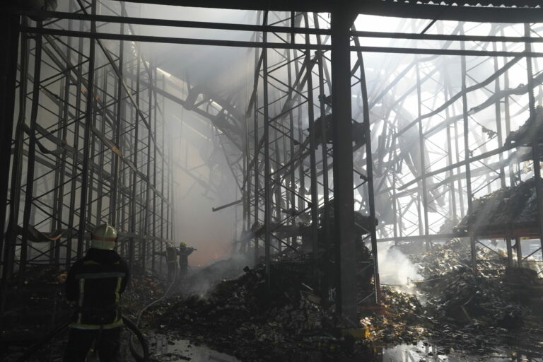 Požiar po ruskom raketovom útoku zachvátil plochu 7-tisíc štvorcových metrov. Hasiči teraz dokončujú záverečné práce, odstraňujú trosky a hasia konštrukcie, aby zabránili opätovnému vzplanutiu.