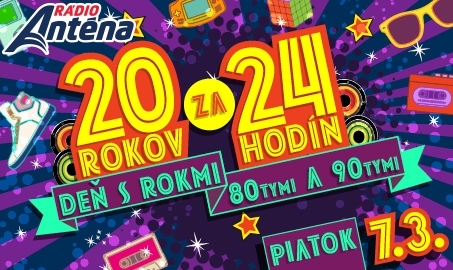 20 rokov hudby s nami prejdete za 24 hodín. Spoločne si zaspomíname na zlaté časy, kedy sa muzika počúvala z walkmanov a fičal Pali Habera. Všetci si pamätali štrngot kľúčov z námestí a Ivana Christová sa stala prvou Miss Československa. Rady na banány neboli až takou dávnou minulosťou a platňa Michaela Jacksona stála 240 korún. V televízii bežal Dallas a Mitcha poznal každý ako záchranára z Baywatchu. Tieto skvelé časy priblížime poslucháčom nielen špeciálne upraveným playlistom, ale aj tematickými vstupmi moderátorov počas celého dňa. Svoju obľúbenú pesničku z rokov 80tych alebo rokov 90tych nám môžete poslať aj vy cez formulár na webstránke www.radioantena.sk.