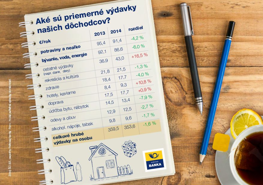 BRATISLAVA 2. októbra (WBN/PR) – Dôchodca na Slovensku mal v minulom roku priemerné mesačné výdavky na úrovni asi 354 eur. Viac ako polovica z jeho rozpočtu samozrejme putovala na potraviny, bývanie a energie. Domácnosti dôchodcov vynaložili mesačne na tieto položky spolu v priemere zhruba 178 eur na osobu. V porovnaní s rokom 2013 sa výdavky na tieto kľúčové položky znížili o takmer 10 eur. „Podpísal sa pod to pravdepodobne celkový cenový vývoj na Slovensku, v rámci ktorého ceny potravín, bývania a energií v ostatnom období prevažne klesali. Veľký vplyv na ceny má najmä stále o zhruba polovicu lacnejšia ropa ako pred rokom,“ vysvetľuje analytička Poštovej banky Dominika Ondrová.