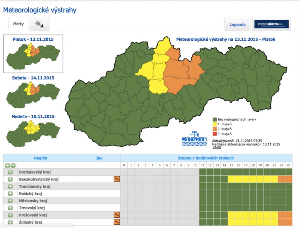 „Táto rýchlosť predstavuje zvýšené nebezpečenstvo pre ľudské aktivity,“ varuje SHMÚ. Výstrahu prvého stupňa pred silným vetrom vydal SHMÚ na piatok, sobotu a nedeľu pre okresy Banská Bystrica, Ružomberok, Martin, Dolný Kubín a Námestovo. Rýchlosť vetra na horách vo vyšších polohách dosiahne 72 až 90 kilometrov za hodinu.